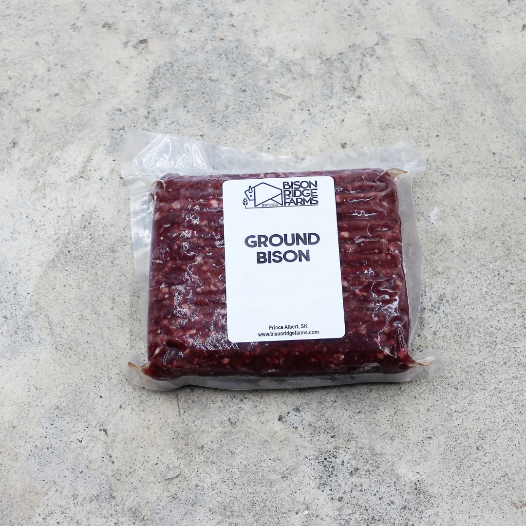 100% ground bison. locally and sustainably raised in Price Albert, SK. No added hormones. No antibiotics