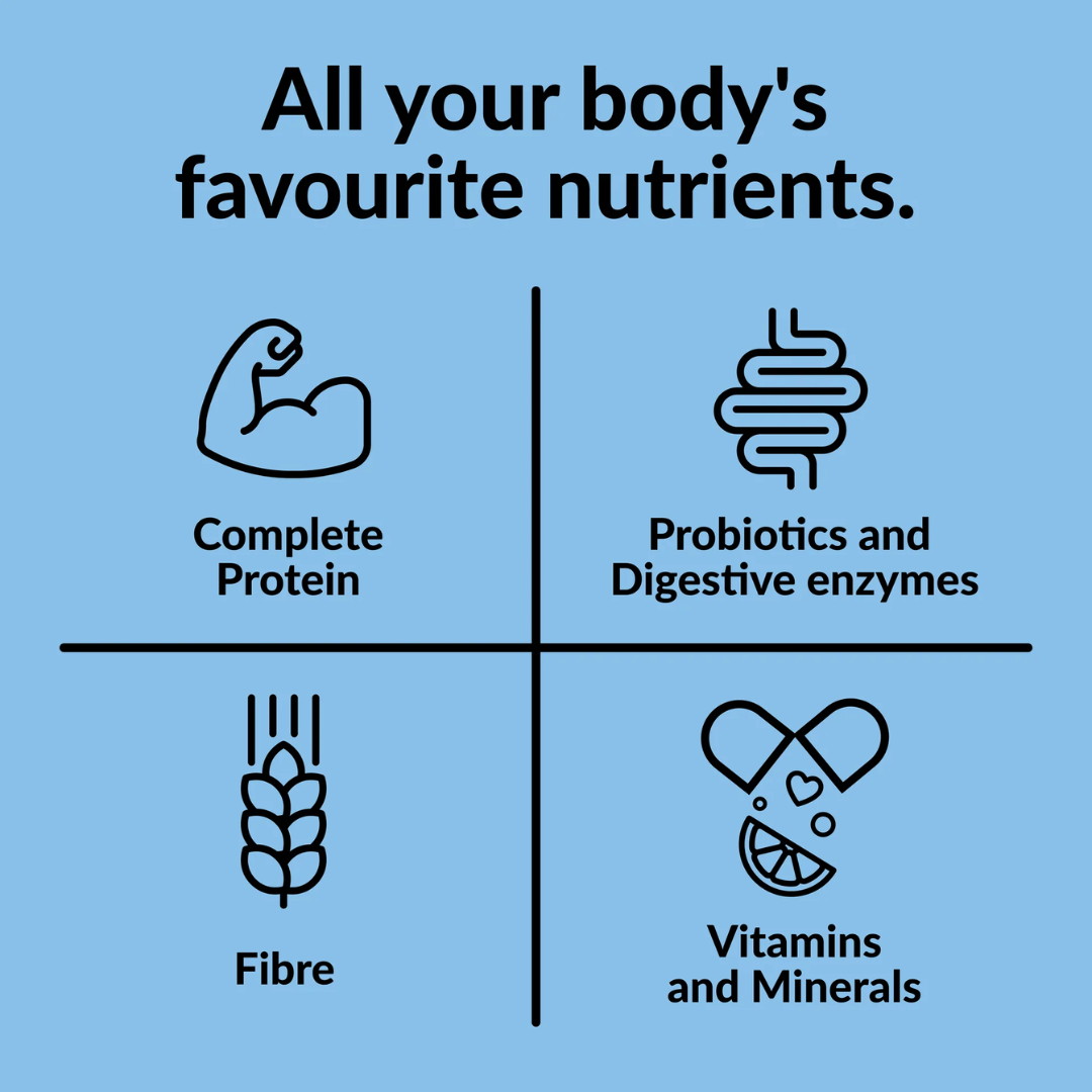 Protein blend (pea protein, milled golden flaxseed), Natural flavours, Soluble tapioca fibers, Coconut milk powder* (coconut milk powder*, tapioca maltodextrin*, acacia gum*), Medium chain triglycerides (medium chain triglycerides from coconut oil, tapioca maltodextrin), Acacia gum, Guar gum, Xanthan gum, Salt, Fruits, vegetables and mushrooms blend (spinach, broccoli, carrot, sweet potato, orange, apple, strawberry, sunflower seeds, shiitake mushroom, maitake mushroom, pomegranate juice powder*, acai juice powder*, goji juice powder*, grape juice powder*, amla fruit powder*, cranberry powder*, aronia powder*, sea buckthorn juice powder*, camu camu powder*, acerola juice powder*), Rebaudioside M, Beta-carotene, Beetroot colour, Bacterial culture and enzymes blend (rice maltodextrin, Bacillus subtilis, bromelain, papain). *Organic ingredients