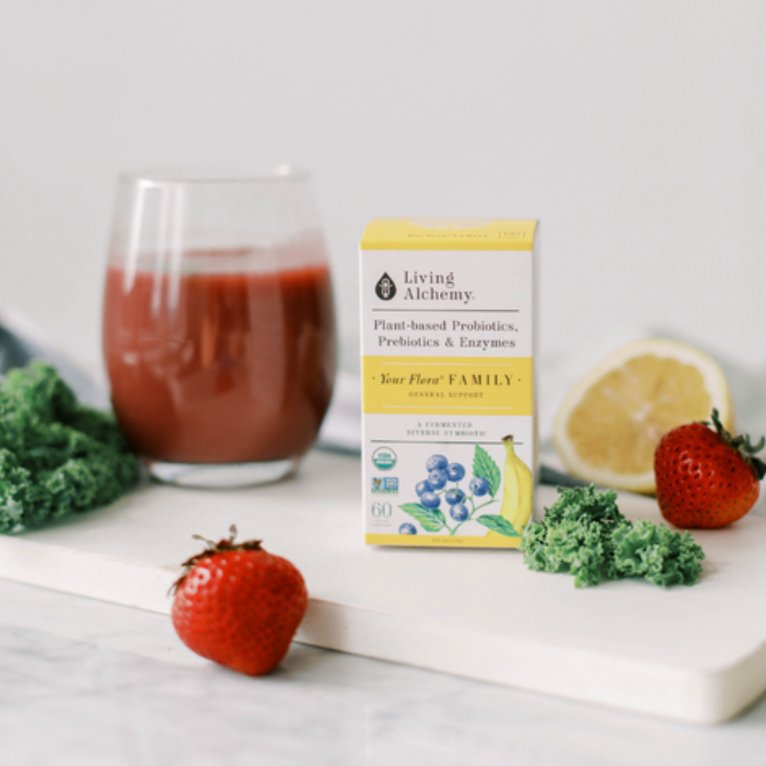 Our Your Flora Family is a 45+ diverse strain kefir-kombucha fermented soybean symbiotic with probiotics, prebiotics, and postbiotics to support healthy gut flora.