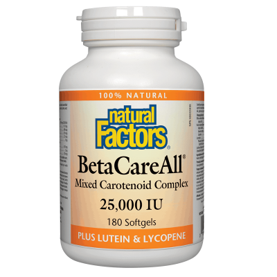 Natural Factors BetaCareAll is a unique mixed carotenoid formula containing natural beta-carotene and beneficial carotenoids such as lycopene and lutein. Converted into vitamin A in the body, beta-carotene is essential to many processes, including maintenance of healthy skin, vision, mucous membranes, bones and teeth, and immune function.