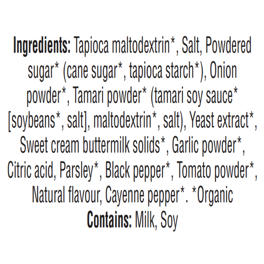 Tapioca maltodextrin, Salt, Powdered sugar* (cane sugar, tapioca starch*), Onion powder*, Tamari powder* (tamari soy sauce* [soybeans*, salt], maltodextrin*, salt), Yeast extract*, Sweet cream buttermilk solids*, Garlic powder*, Citric acid, Parsley*, Black pepper*, Tomato powder*, Natural flavour, Cayenne pepper*. *Organic